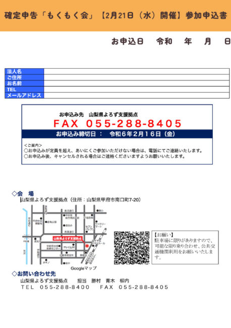 確定申告『もくもく会」~DX化で申告は便利になる!~ セミナー 最終更新日:2025年4月10日 シェア シェア 送る コピー セミナーの概要 1人だとなかなか手を付ける気にならない確定申告…今年こそ!みんなで早めに確定申告を済ませてすっきりしちゃいませんか? DX化て?申告は 便利になる! セミナーの詳細 開催日2024年2月21日(水) 10:00〜12:00 開催場所山梨県よろず支援拠点 このイベントの受付は終了しました